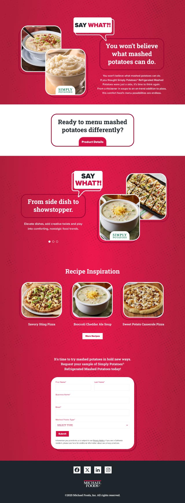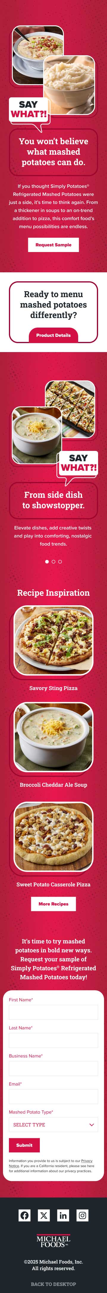 Designed campaign landing page, banner ads, and email for Michael Foods Simply Potatoes® Refrigerated Mashed Potatoes.